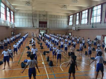 まずは体育館に集まり、開会式と準備運動です。
