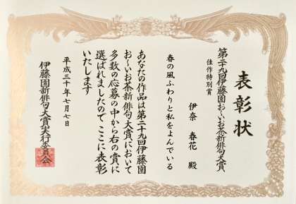 おーいお茶新俳句大賞で、佳作特別賞に2年1組の伊奈春花さん、佳作に3年2組の畠中一輝さんが表彰されました。おめでとうございます。