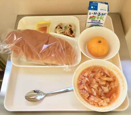 本日の献立は、豆乳マカロニグラタン[米粉]、トマトスープ、みかん(冷)、パン、牛乳です。