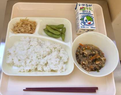 本日の献立は、マーボーなす、もやしのごま酢あえ、枝豆、米飯、牛乳です。