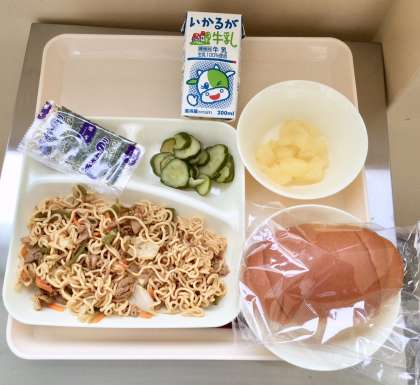 本日の献立は、焼きそば(きざみのり付)、きゅうりの甘酢づけ、洋なし(缶)、1/2パン、牛乳です。