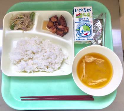 本日の献立は、たこのやわらか煮、みそ汁、野菜いため、焼きのり、米飯、牛乳です。