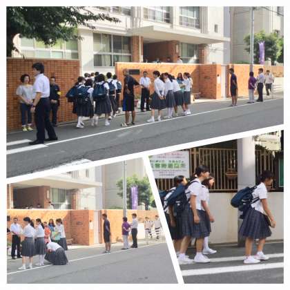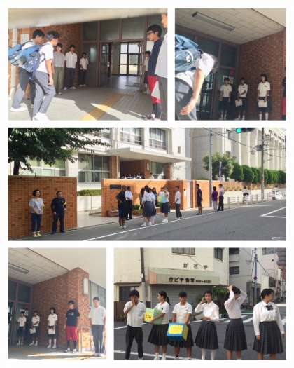 生徒会生活委員は、いつも通り玄関でのあいさつ運動。正門では、生徒会役員がペットボトル回収をしながらのあいさつ運動、そして先生方と一緒に取り組むことができました。