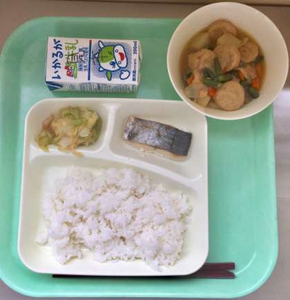本日の献立は、さごしの塩焼き、じゃがいもと一口がんもの煮もの、キャベツのおひたし、米飯、牛乳です。さごしとは、成長するにつれて名前が変わる出世魚で、50CMぐらいまでをさごし、70CMぐらいまでをやなぎ、70CM以上を鰆(さわら)と呼びます。