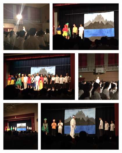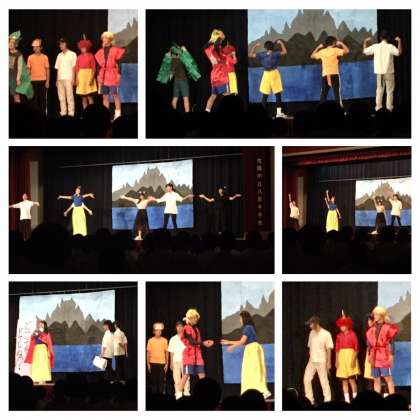 主人公は「ピーチボーイ」です。桃が流れ着いて登場しました。家を訪ねてきた魔女はきび団子と交換に毒りんごを置いていきます。そこにやってきた白雪姫率いる警察は、ピーチボーイを毒りんごをつくった罪で捕まえようとしますが、疑いは晴れたものの、白雪姫は毒りんごを食べて倒れてしまいます。神様のお告げのかいあり生き返った白雪姫は、ピーチボーイと結ばれ、鬼ヶ島で幸せにくらしましたとさ。誰もが知っている登場人物たちがくりひろげる摩訶不思議な物語。ピーチボーイは白雪姫とダンスバトルまで。子どもたちの自由な発想が生みだした楽しい劇でした。
