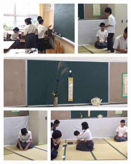 先生方を招待してのお点前です。本校には和室がないので多目的室に畳を敷いての茶室です。床の間はありませんが、「和敬清寂」の掛物と季節の花でおもてなしがされています。
