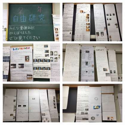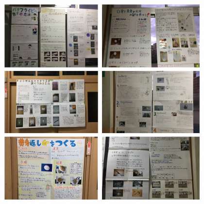 一人ひとり自分の研究したいことをテーマに設定し、官給した作品を展示しています。「青い空と夕焼けの原理」「ペットボトルの水を早く出すには・・・」「ダンゴムシの足の数」「太陽系の主な天体をくわしく知ろう」「紙飛行機を遠くに飛ばすには」・・・様々なテーマがありました。