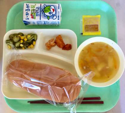 本日の献立は、まぐろのオーロラ煮、スープ、きゅうりとコーンのゆずドレッシング、パン、牛乳です。