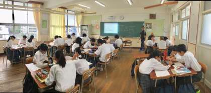 校長経営戦略支援予算を活用して、夏季休業中に1年生4クラス・2年生4クラス・理科室にプロジェクターを据え付ける工事を完了し、様々な授業で活用しています。