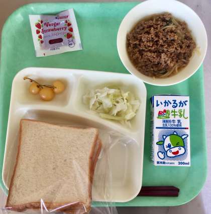 本日の献立は、タンタンめん、キャベツの甘酢づけ、さくらんぼ(缶)、パン、牛乳です。いちごジャムがついてます。