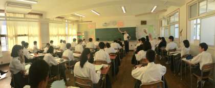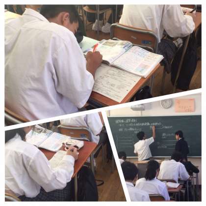 本時は「選挙のしくみ」、まずは教科書を音読します。先生独自のオリジナルプリントが配布され、早速、重要語句を各自で記入します。「選挙権と選挙のしくみ」、指名された生徒が黒板へ記入・・・ここで先生からの質問、1890年第1回衆議院選挙では○○○○○○円以上を納める○○歳以上の○○・・・ テンポよくわかりやすい例を提示しながら、授業が展開されていきます。日本の選挙制度、大選挙区制・小選挙区制・比例代表制を身近な具体例で生徒たちの理解が進みます。思わず引き込まれてしまう先生の話術で、あっという間の50分集中した授業を終えました。