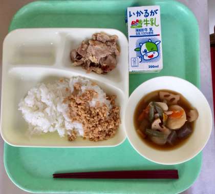 本日の献立は、豚肉のねぎじょうゆ焼き、ふきよせ煮、ツナ大豆そぼろ、米飯、牛乳です。ふきよせ煮は、さといも・れんこん・にんじん・たまねぎ・こんにゃく・しめじ・三度豆と野菜がたっぷりです。ご飯にかけた、ツナ大豆そぼろも美味しいです。