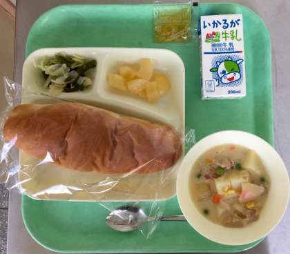 本日の献立は、コーンクリームシチュー(米粉)、キャベツと三度豆のサラダ、白桃(カット缶)、パン、牛乳です。シチューの鶏肉がとても柔らかく美味しいです。パンには、マーマーレードがついてます。