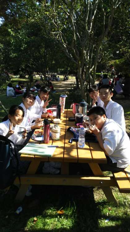 和やかな昼食タイム。自然の中、みんなで食べるお弁当は本当においしいなー!!食後にはクジラの化石をパクリ!?ハートの鐘を鳴らして幸せ気分です。