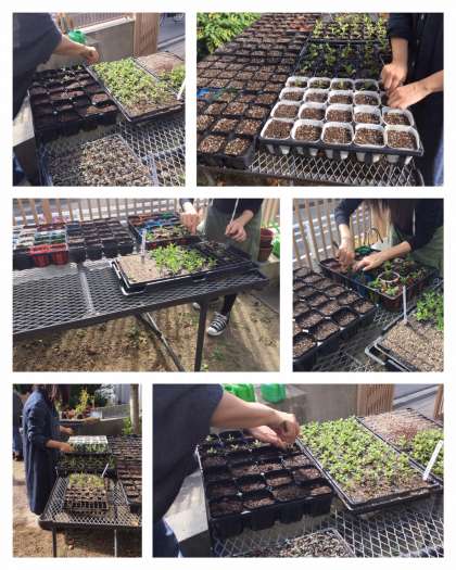 区役所と連携した「種花事業」、10月3日に小さな種を播種。10月22日にセルトレイへ移植。そして本日(11月5日)は成長した苗をポットへ植え替える作業を行いました。学校元気アップコーディネーターと緑化ボランティアの方に来校していただき、ピンセットでていねいに苗をセルトレイから引き出し、一苗ずつポットへ移植します。