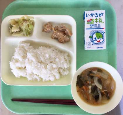 本日の献立は、鶏肉のしょうゆマヨネーズ焼き、なめこのみそ汁、キャベツのいためもの、米飯、牛乳です。