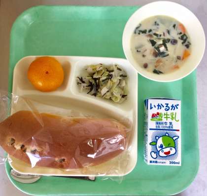 本日の献立は、きのこのクリームシチュー、キャベツのひじきドレッシング、みかん、ぱん、牛乳です。