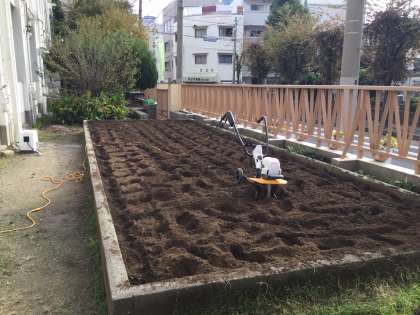 通学路からもよく見え、見苦しくなっていましたので電動耕運機で耕しました。よく肥えた良い土です。クワを使って、畝を作りました。