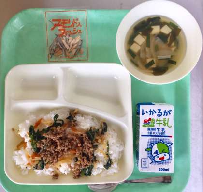 本日の献立は、ビビンバ、わかめスープ、アーモンドフィッシュ、米飯、牛乳です。