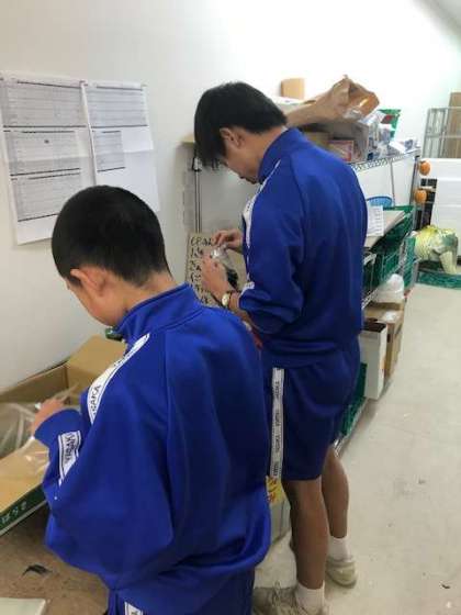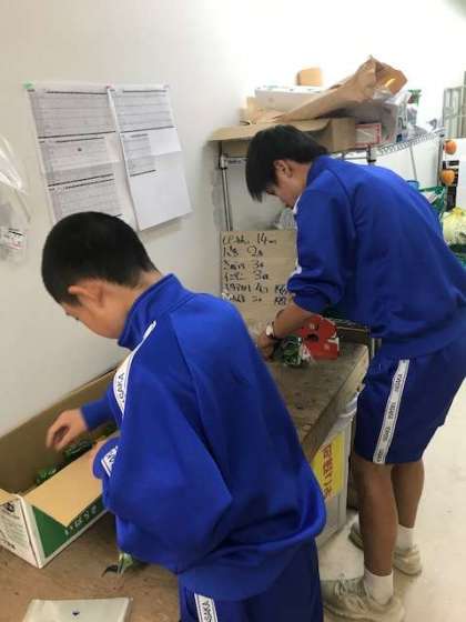 八百鮮の裏でピーマンの袋詰めをしています。
