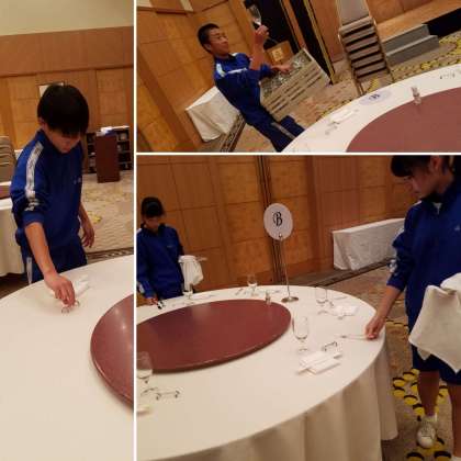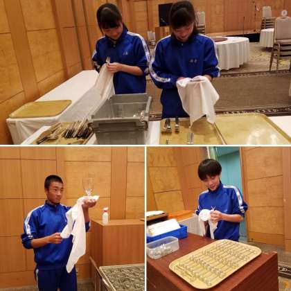 素敵なホテルでのお仕事、とても緊張します。午前中にホテルの中を案内してもらい、たくさんの部署があることを教えてもらいました。午後からは宴会場の設営です。食器やグラスをきれいに磨いて、テーブルに並べていきます。一つ一つ丁寧に、心を込めて作業しています。