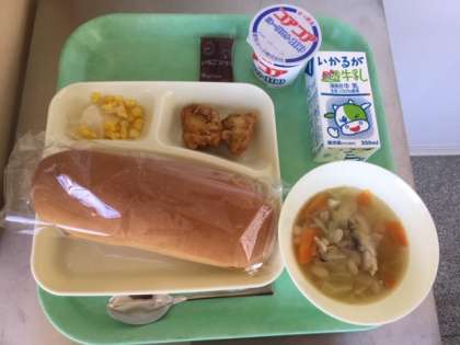 今日の給食は、パン・イチゴジャム・白身魚のフリッター・スープ煮・だいこんのピクルス・ヨーグルト・牛乳です。フリッターからは香ばしい海苔の香りがします。