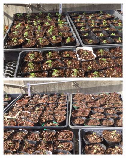 セルトレイの金魚草(ホワイト・レッド)が、やっと植え替えに適した苗に成長しました。ポットへの移植作業を行い、レッドが128P,ホワイトが80Pの計208ポットに植え替えることができました。花の色の違いで、苗の色も違っているのが不思議です!