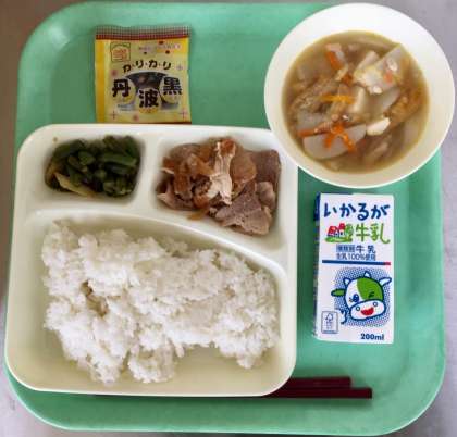 本日の献立は、豚肉のしょうがじょうゆかけ、けんちん汁、三度豆のからしじょうゆあえ、いり黒豆、米飯、牛乳です。