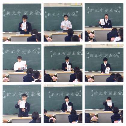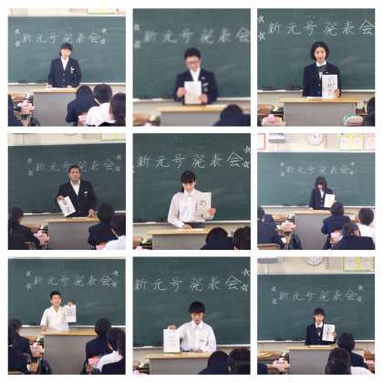 本時は、「スピーチ『新元号発表会』」です。自らが漢和辞典や国語辞典を利用して新しい「元号」を考え、自ら考えた元号を清書したものを示しながら、一人ずつ発表していきます。堂々とした発表が続きます。豆・黄金・和平・安秦・雅懐・安穏・命数・の・個性・安生・和睦・安寧・開晴・大喜・光和・グルメ・改新・厚福・・・「元号」にした理由、新しい時代への期待など、聞いていてなるほどと納得させられる内容の数々でした。発表者の内容を聞き取り、評価や感想をプリントに書き込みます。自分の意見を発表し話す力を養うとともに、聞く力・書く力を養うことのできるクラス全体がまとまった素晴らしい発表会形式の授業展開です。次回も発表が続きます。