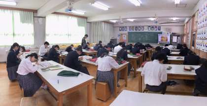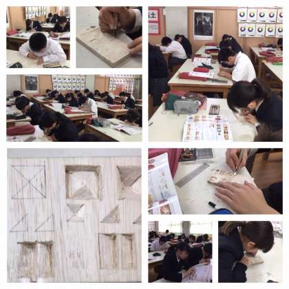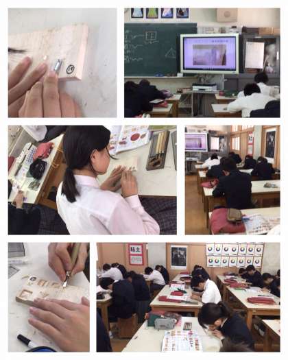 平成30年12月5日(水)4限目、美術室において2年1組の美術科校内研究授業を行いました。学習内容は、「木彫の技法を学ぶ」。ICTを活用して、彫刻刀の使い方等を動画で確認させます。各自1枚ずつ板と彫刻刀を準備して、実際に実技に取り掛かります。彫刻刀を持つ手や木板を見つめるまなざしが真剣です。先生が机間巡視をしながら、それぞれの疑問や技法について、的確にアドバイスをしています。刃物を使うため、安全面に注意した「集中した授業」が展開されています。ものづくりの楽しさを味わうこで、生徒たちの表情が生き生きしていました。
