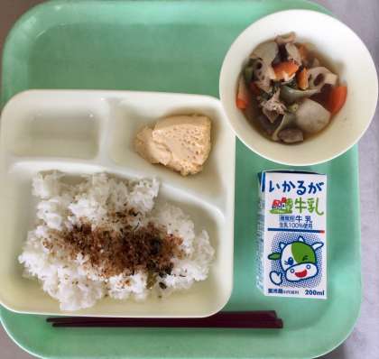 本日の献立は、卵どうふ、豚肉とさといもの煮物、おかかなっ葉、米飯、牛乳です。卵どうふは、卵(液卵)にだしを加え、みりん、塩、しょうゆで味つけし、焼き物機で30分間蒸して作っています。