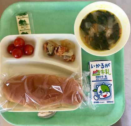 本日の献立は、さけのマリネ、肉だんごと麦のスープ、プチトマト、パン、牛乳です。パンには、マーガリンがついています。肉だんごと麦のスープには、冬が旬のだいこん、ほうれん草が入っています。押し麦は、植物繊維を多く含み、麦の食感を楽しめます。