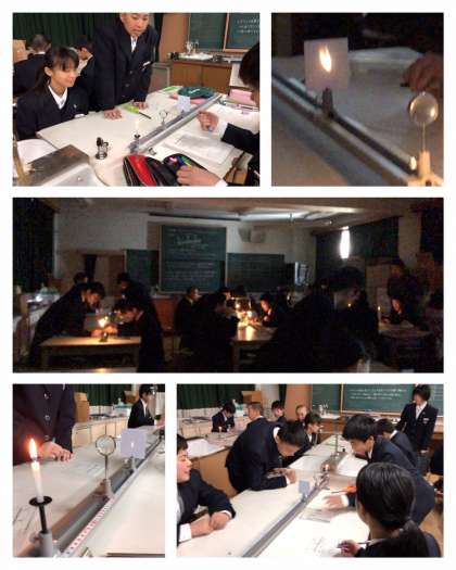 理科の授業は、「光による現象・凸レンズのはたらき」を実験で考察するというものでした。光学台にセットした、ろうそく・凸レンズ・スクリーンをつかって、焦点距離と像の関係を考えていきます。「ろうそくと凸レンズが焦点距離の2倍の位置にある時、逆向きに実像を結ぶ。その位置を基準に、内なのか外なのかで像の現れが変わる。」との先生のまとめに、あらかじめ授業で学習した凸レンズのはたらきが深まって理解されました。