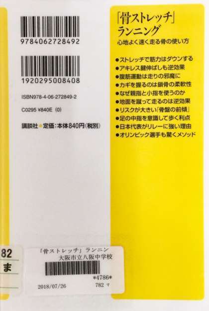 本日(1月21日)の全校集会で、校長先生が紹介した本「骨ストレッチ」ランニング〜心地よく早く走る骨の使い方〜の表紙と裏表紙です。