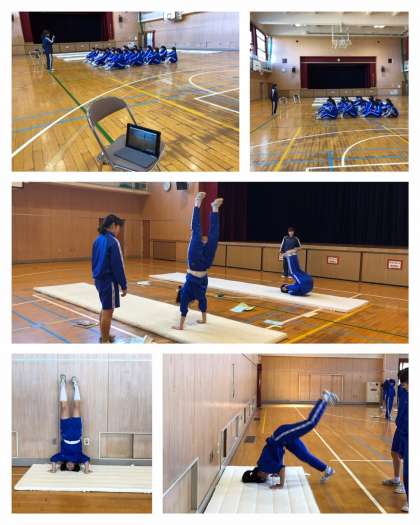 3年女子保健体育科では、マット運動の授業をしています。器械運動の専門家である校長先生が見学に来られて、アドバイスをしていただきました。