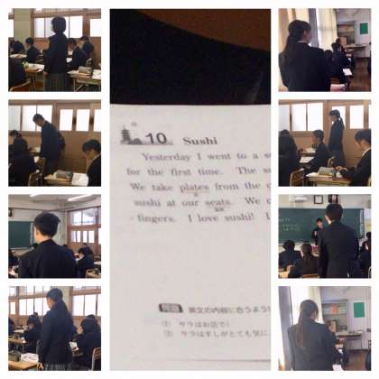 本校では「50分間集中した授業」に取り組んでおり、チャイムと同時に学習活動に入ります。「読み取れ50」によるリーディングトレーニングです。本時は、Sushiが題材で、先生が内容に関して英語で質問し、英語で答える・・・回転寿司のお話で、好きなネタは(すべて英語での質問です)、ツナ・サーモン等と回答しています。無駄のない授業展開です。