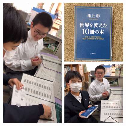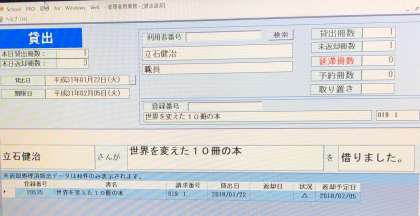 1月22日(火)お昼の開館時間、校長先生が一冊の本「世界を変えた10冊の本(池上彰)」の貸し出しをお願いしました。図書委員さんが手際よくバーコードリーダーで利用者と貸し出す本を読み取ります。パソコン画面にすべてのデータが瞬時に写し出され、そのデータを確認し、返却日は2月5日ですと小さな紙に記入し、本と一緒に手渡してもらいました。気持ちよく本を借りることが出来ました。図書委員さん、ありがとうございます。