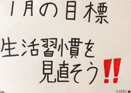 生活委員会で目標を毎月決め、玄関掲示板にポスターにして掲示しています。