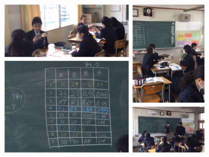 ジャンケンを10回して、7回勝ったら勝率7割・・・導入があってから、3人組の班にしてトランプを使った実験(?)が行われました。黒3枚・赤2枚のカードを相手に分からないように示して引いていきます。一人20回引いて、黒赤が何枚ずつでるかを記録します。・・・9つの班が結果を黒板に記入、各班様々な結果ですがトータルすると黒324枚、赤216枚。なんと見事に、黒5分の3、赤5分の2の確率!