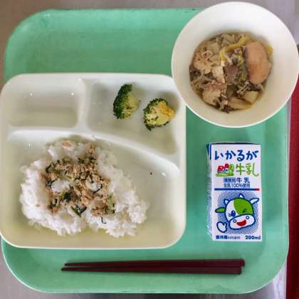 本日の献立は、すき焼き煮、ブロッコリーのしょうがづけ、ツナっ葉いため、米飯、牛乳です。すき焼き煮は、アレルギー対応として「ふ除去食」が用意されています。ツナっ葉いためは、配膳時に盛り付けたご飯に添えて食べます。