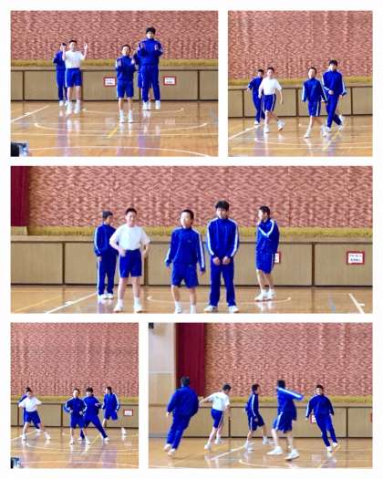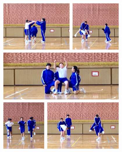男子6人グループです。残念ながら体調をくずして一人がお休みのため5人での発表です。音楽に合わせてグルグル回ります。ジャンプもそろってます!トンネルや馬跳びをダンスに取り入れる工夫。フィニッシュも決まりました。