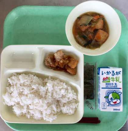 本日の献立は、あげ鶏のねぎソースかけ、あつあげとはくさいの中華煮、焼きのり、米飯、牛乳です。