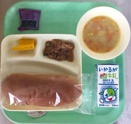 本日の献立は、牛肉のデラックスソース煮、コーンスープ、かぼちゃのプリン、パン、牛乳です。3年生にはブルーベリージャムがついています。(1・2年生は、2月20日に配布される予定です)