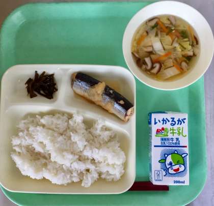 本日の献立は、さんまのみぞれかけ、すまし汁、茎わかめのつくだ煮、米飯、牛乳です。