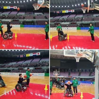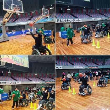 試合の後に、フロアに降りて車イスバスケットボールの体験をさせてもらいました。腕だけで車イスとボールをコントロールするのはとても難しく、みんな苦戦していました。何度か挑戦してうまくゴールを決めている生徒もいました。