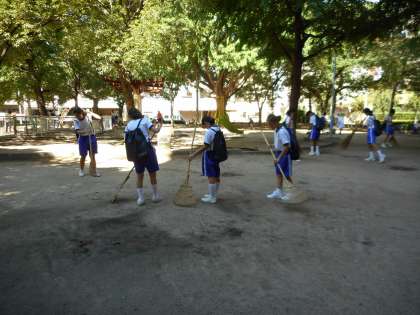 夏休みもあと少しになってきました。8月18日(月)に昭和58年から続いている三中合同清掃が行われました。これは中学生と地域の女性会の方々がともに校区内を清掃するというものです。本校では、鷺洲上公園の清掃を行いました。夏場なのに意外と落ち葉が多く、ほうきや熊手を使い集めていきました。途中から福島区長もお見えになり、さっそく子どもたちと一緒に清掃されていました。みんなが熱心に取り組んだおかげで、短時間で公園がきれいになりました。今後も地域の方々とともに活動することで、たくさんのことを学んでいきたいと思います。