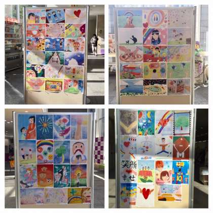 生徒の作品の数々を展示しています。ぜひ、区役所に足を運んでいただき、生徒一人一人の思いのこもった作品をご覧ください。(写真は逆光のため少し見づらく申し訳ありません)