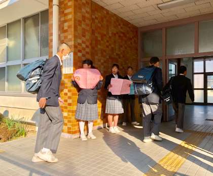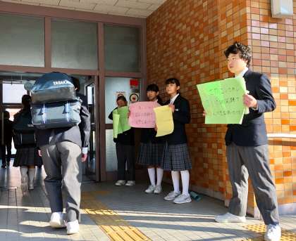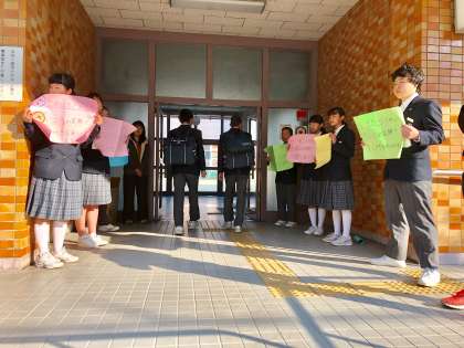 生活委員は、今日もポスターをかざしながら大きな声で朝のあいさつ運動に取り組んでいます。