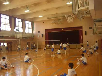 写真は上から実習生の授業、英語、国語、保健体育(バレーボール)の様子です。