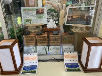 先日紹介した管理作業員室前の水槽のデコレーションが、バージョンアップしました。虫の模型と虫の声が流れるようになっています♪